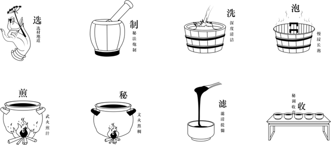 真正的非遗膏方,坚守古法工艺的精髓要义,摒弃简单调配的速成模式,以师徒口耳相传的经验把控火候、拿捏分寸,从药材炮制到慢浸长泡,从武火煎汁到文火熬稠,从滤清提髓再到秘调收膏时的“挂旗”状态,直至达到“黑如漆、亮如镜,一拉成丝、滴水成珠”的优质膏滋标准。每一步都遵循古法、精益求精,让八大工序的技艺精髓得以完整呈现。
