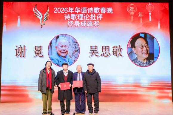 作为华语诗坛年度盛事,晚会特别设置了表彰环节,颁发了2025年度十佳华语诗人、十佳华语新锐诗人、十佳华语打工诗人、十佳华语诗集、年度优秀诗歌团体等多个奖项,充分展现和表彰并传播当下华语诗人的优秀创作成果。此外,评委会还颁发了终身成就奖:谢冕、吴思敬获诗歌理论批评终身成就奖,吉狄马加获诗歌创作终身成就奖,赵振江获诗歌翻译终身成就奖,以表彰他们在各自领域的卓越贡献。